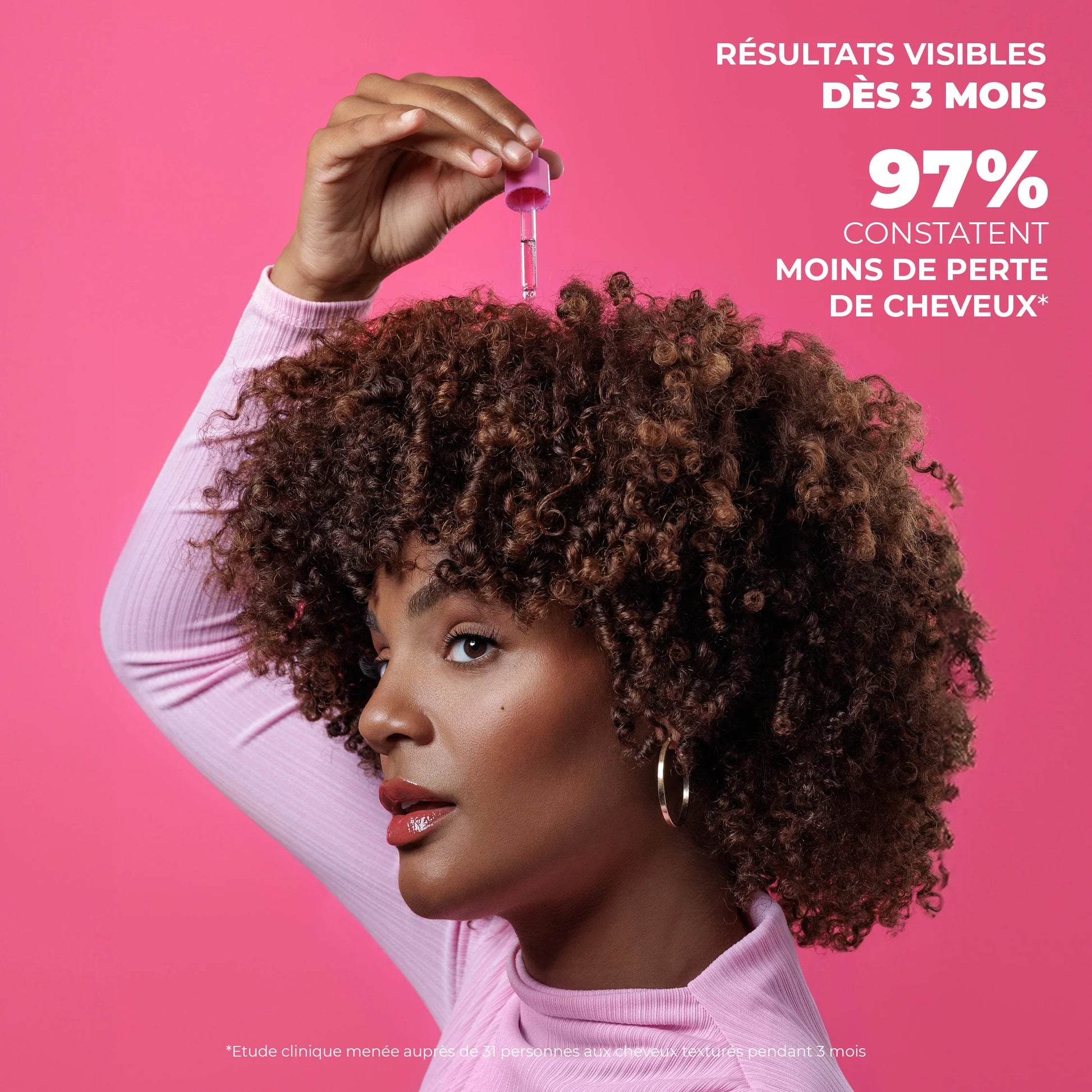 Le sérum Kurl Hero, spécifiquement formulé pour les personnes aux cheveux texturés, est conçu pour agir sur la chute réactionnelle.